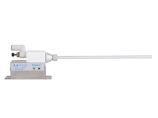 The two nozzles are located just before entering the loading station. One nozzle is towards the outside of the container and the other is towards the inside of the container. The annular bar is located near the height of the filling head, where the end of the distribution pipe is also located. In this way, powder adsorption to the container walls and accumulation of powder on the filling head is eliminated. Optional KP2001A strong wind ion nozzle