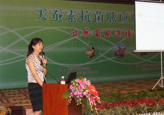 中農(nóng)穎泰公司李波博士向與會代表介紹了天蠶素抗菌肽的應(yīng)用技巧。天蠶素是第一個被發(fā)現(xiàn)的動物抗菌肽,大量研究結(jié)果表明,天蠶素抗菌肽可以替代金霉素、桿菌肽鋅等常用飼用抗生素,并具有促進動物生長、增強免疫功能,改善畜產(chǎn)品品質(zhì)、增進人類健康等功能。李博士對天蠶素抗菌肽在國內(nèi)的研究動向,并從其安全性、生物特性、穩(wěn)定性等方面進行闡述。還展示了在大鼠、肉雞、仔豬及水產(chǎn)上的實驗效果,并根據(jù)實驗結(jié)果提出了相應(yīng)的飼喂方案。